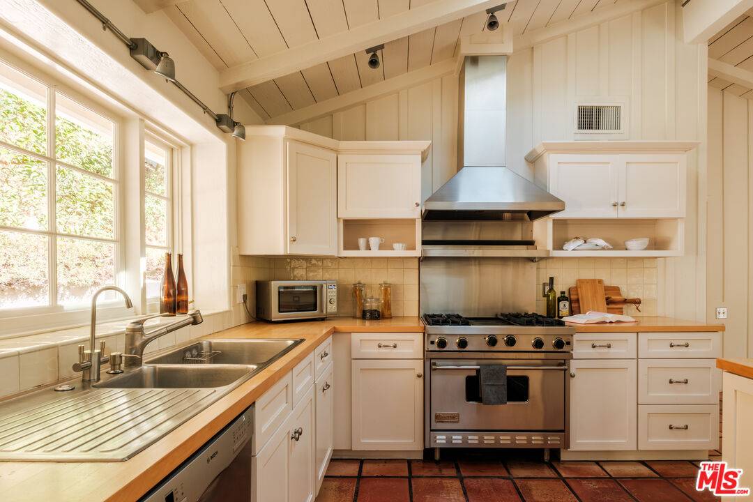 Perched above Old Ranch Road in the coveted equestrian enclave of Sullivan Canyon, this Cliff May designed home exudes the integrity and rustic origins of a California Ranch. Like many Cliff May homes, the courtyard mingles with and also creates space between the primary suite and (3) guest bedrooms. Through French doors, each sun-drenched room opens to the tranquil and bucolic grounds canopied by mature sycamores and oaks. Pitched shiplap ceilings, skylights, and terracotta tile floors complete a true gem that is only minutes from the Brentwood Mart and Riviera Country Club.
